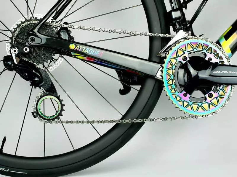 Les galets en polymer sont plutôt silencieux mais peu durables. Les galets en aluminium répercutent quant à eux beaucoup plus le son du contact avec la chaine en augmentant ainsi le bruit de la transmission. AbsoluteBlack propose donc une toute nouvelle génération de galets qui réduisent le bruit de la transmission de 12 à 14 dB comparé avec les galets Dura Ace d’origine. Cela représente plus de 60% de réduction de bruit soit une transmission quasiment silencieuse. Pour cela la marque utilise une technologie brevetée qui repose sur des caoutchoucs XRING qui amortissent les chocs de la chaine contre les galets et eliminent ainsi tous les bruits parasites.