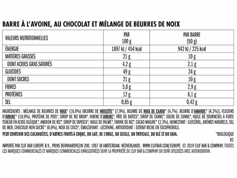 Les barres énergétiques Clif Nut Butter Bar sont d’origine naturelle et certifiée biologique. Chaque barre Clif comprend un mélange sain de graines entières, de protéines et de fibres, mais sans graisses. Elles sont parfaites pour vous redonner de l’énergie quel que soit votre sport .